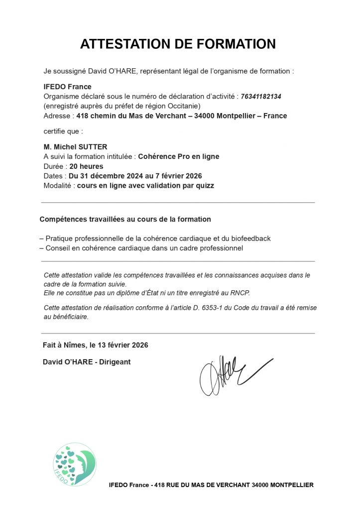 En 2020, j’ai approfondi et validé mes connaissances et ma pratique auprès du Dr David O’Hare spécialiste mondial de cette méthode au sein de l’IFEDO et auprès de l’Institut PI Conseil dirigée par Claude Deglon où j’ai retrouvé avec plaisir l’enseignement du Dr Cungi. Enfin j’ai pu partager avec Gwénaêl Knichel chez Elide Formation.